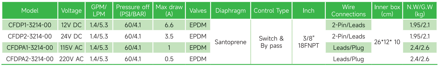 50pcsCaracterísticas: • Caudal abierto: 5,3 LPM (1,4 GPM) • Presión máxima: 60 PSI (4,1 BAR) • Voltaje del motor: 12 VCC/24 VCC/110 VCA/220 VCA • Funcionamiento en seco, sin daños • Desplazamiento positivo de 3 cámaras • Funcionamiento silencioso. • Ciclo de trabajo: Intermitente (el tiempo de funcionamiento continuo varía según la presión). • La bomba se puede utilizar con los siguientes controles: • Control de presostato o control de derivación. Para el control de potencia, puede elegir una bomba sin presostato o